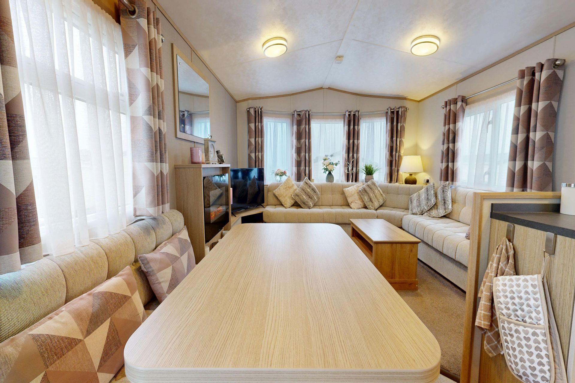 Step inside this 2 bedroom holiday home and the space hits you first. The open-plan lounge wraps comfortable L-shaped seating around an electric fireplace and TV stand - enough room for the whole family to actually sit together. USB-equipped plug sockets mean you can charge devices whilst using the outlet. Small detail that makes holidays easier.