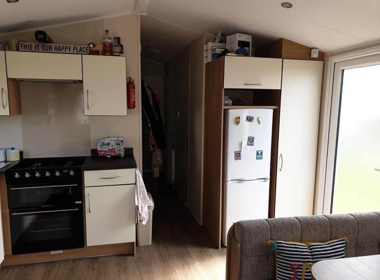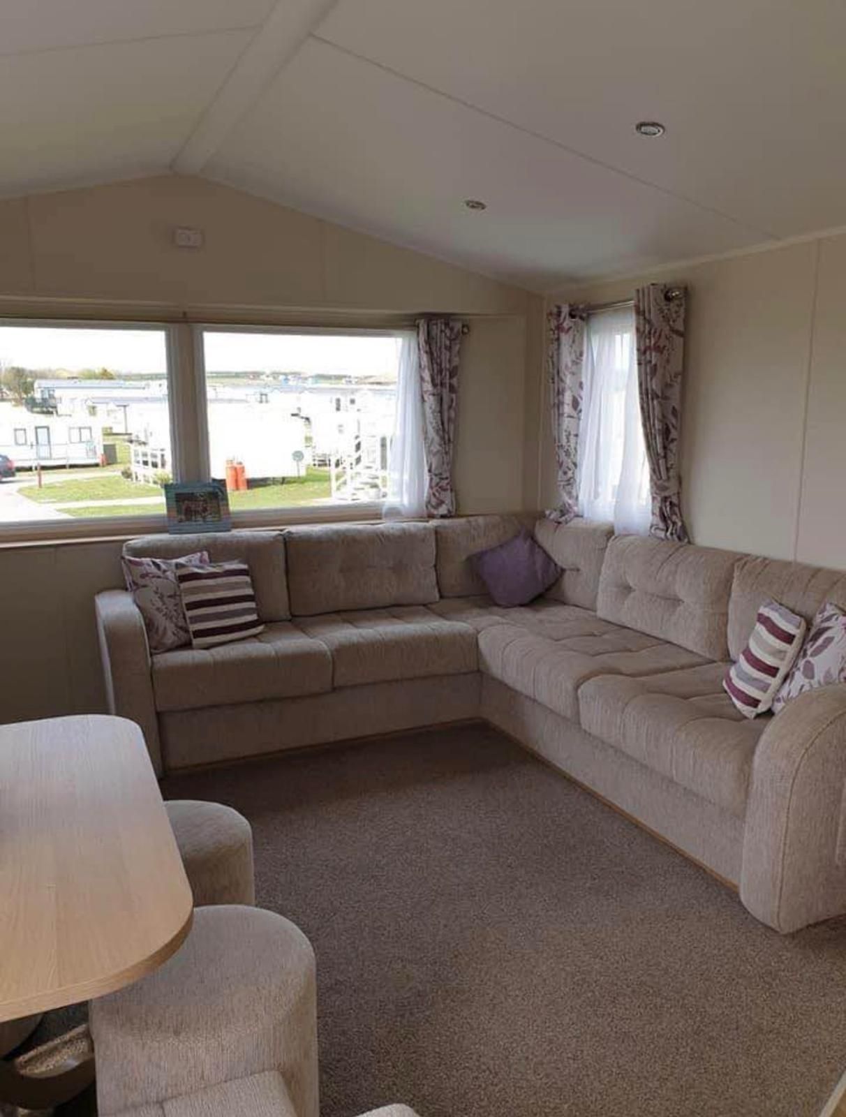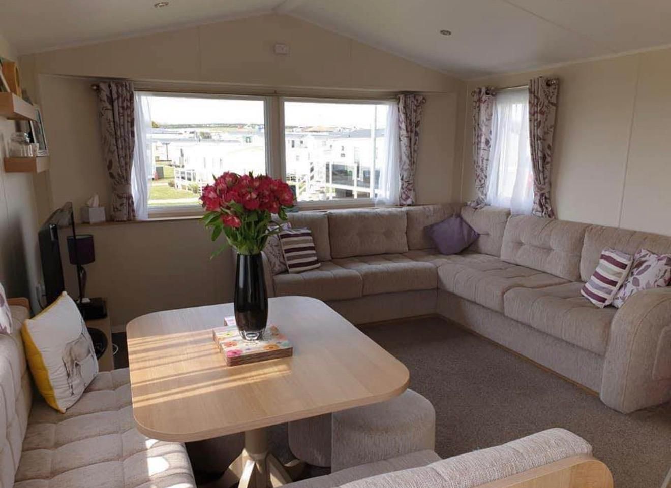 The living space works. Open-plan lounge with plush seating and windows that actually let the Yorkshire coast light flood in, especially on this south-facing pitch where you get sun all day. The kitchen's fully equipped, not the sort where you're hunting for a decent pan or wondering where the tin opener's gone and the family bathroom handles the morning rush without drama.